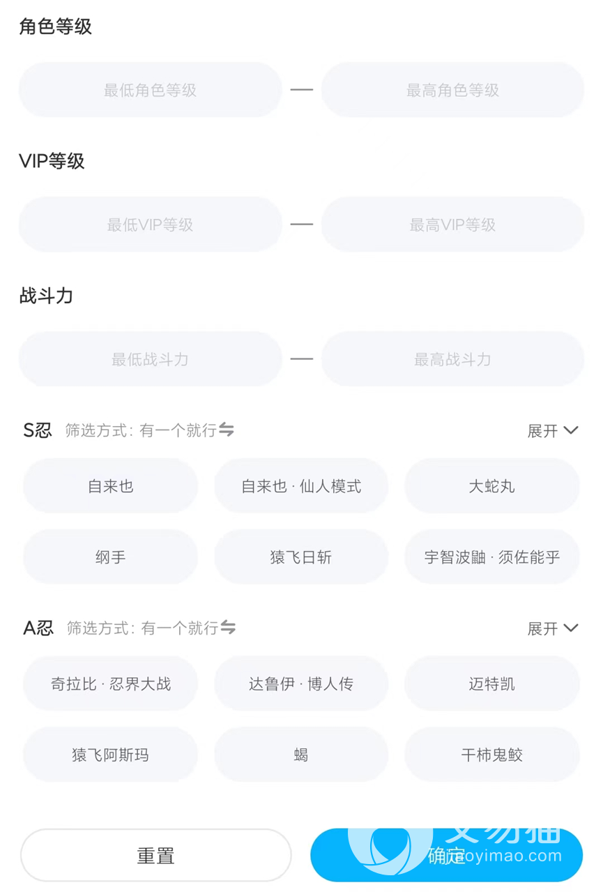 大家想要买号的话,实现肯定已经了解过这个游戏的玩法和角色的等级了,S忍是最高等级其次是A级忍者,大家想要高级忍者账号的话就可以在平台内火影游戏专区内点开筛选栏就可以选择自己喜欢的忍者角色账号拉。