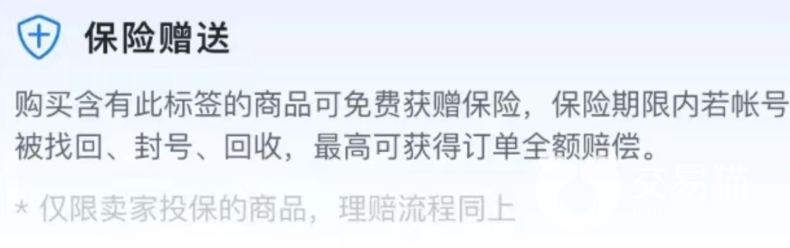 2、而经常在其他小平台当中去买号的玩家,想必也感受过刚刚买到的游戏号,突然被系统封号或者提示已经被回收,这些都是买到了各种低质量游戏账号的原因。而交易猫平台内,只要卖家投保了保险赠送的服务,大家都可以无视这些不稳定因素,即便再一次的遇到,也都将得到平台的兜底。