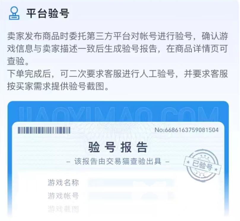 3、接下来,则是每一个玩家在买号时最怕遇到的问题了,一个游戏号是否真实存在的疑虑会让很多玩家停止自己的买号想法。毕竟由于部分交易平台监管不力,会导致大量虚假账号交易出现,玩家也会上当受骗。而在交易猫中,一些高级账号会得到平台的验证,真实性没问题之后才会出现在交易专区当中。