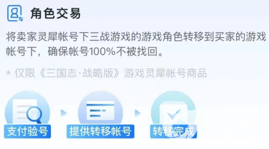 首先,小编直接建议各位想要拥有一个稳定安全的交易环境,就直接来尝试体验一下交易猫app。因为该平台会针对部分商品开启独特的角色交易服务,此服务会直接将游戏角色转移到玩家的账号当中,虽然目前只支持三战灵犀渠道账号,刚好正在玩这款游戏的玩家,可以直接来体验一番。