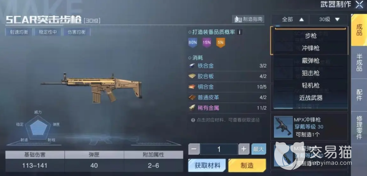 其基础的五维面板,我们可以看到其特点也是射速均衡、稳定性中且伤害不高不低,没有什么突出的特色,自然也就没有一些棘手的缺点,非常推荐各位新手玩家作为前期过渡和中期的主力武器使用。哪怕是到了游戏中后期,这个也可以放在第二把枪那里,作为备用枪械。