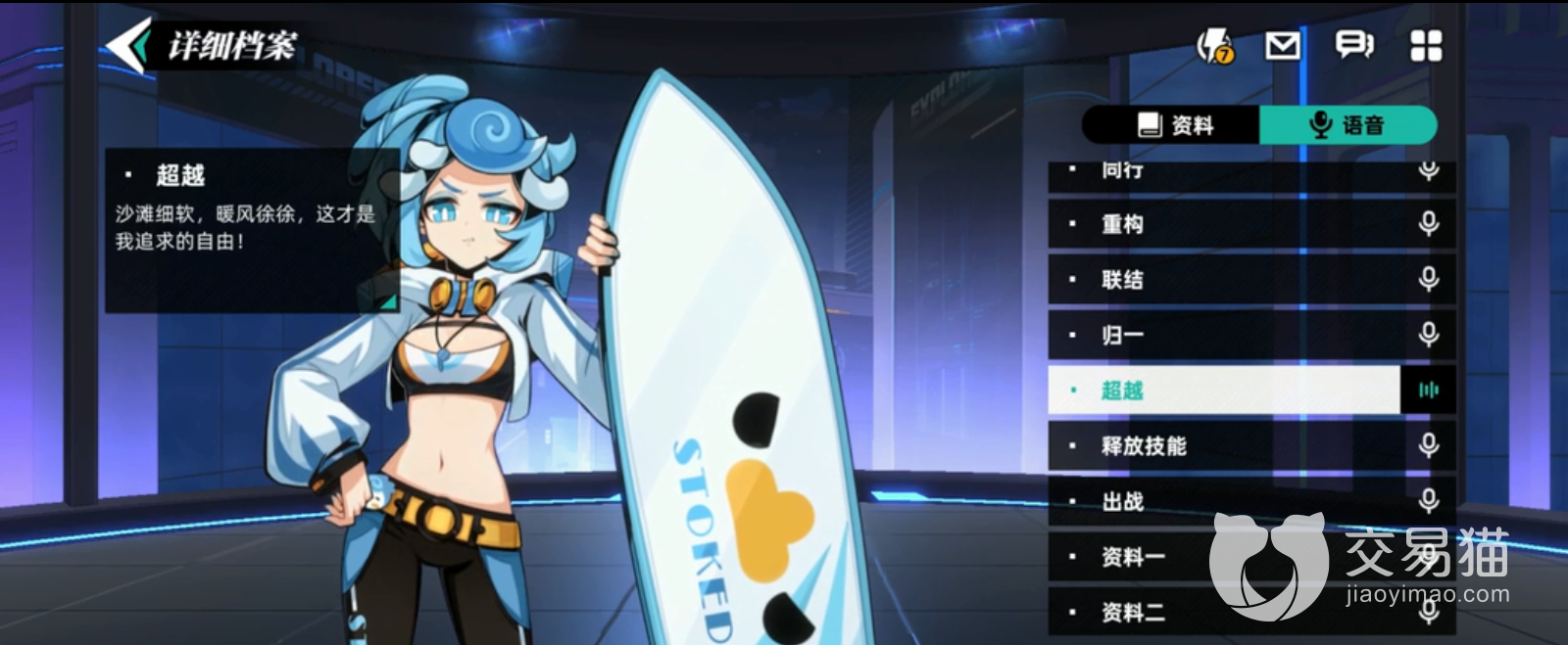 她的一技能是可以让角色踩着冲浪板向前滑动,进行攻击。当攻击对象的血量超过50%时,在发动进攻之前有60%的几率对敌人造成,持续一个回合的冰冻伤害。