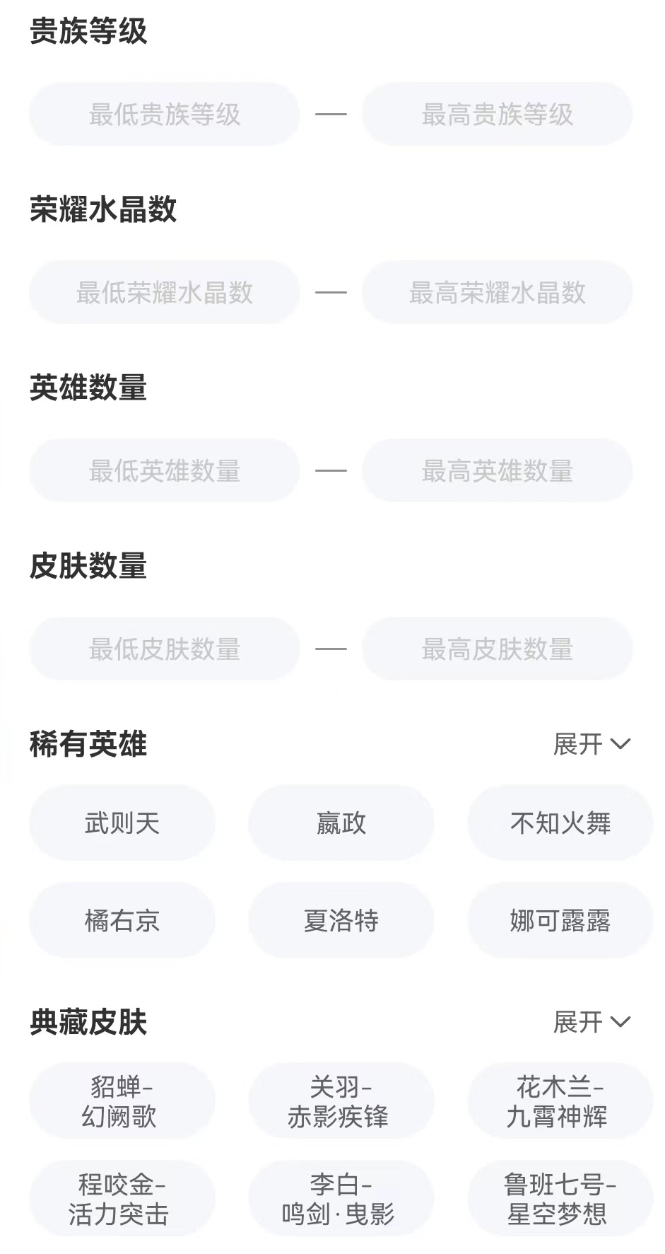 上架之后的账号中将里面最有价值部分清晰展现在买家眼前,例如所拥有的英雄数量,水晶数量,以及当前充值达到的贵族等级,拥有稀有英雄和各种皮肤等,以列表形式展现出来。这样方便了买家查找,对于提高交易速度是非常有好处。这些模板在自行上架时候就已经填写完毕,不需要出售者再寻找其他亮点,操作起来很简单。
