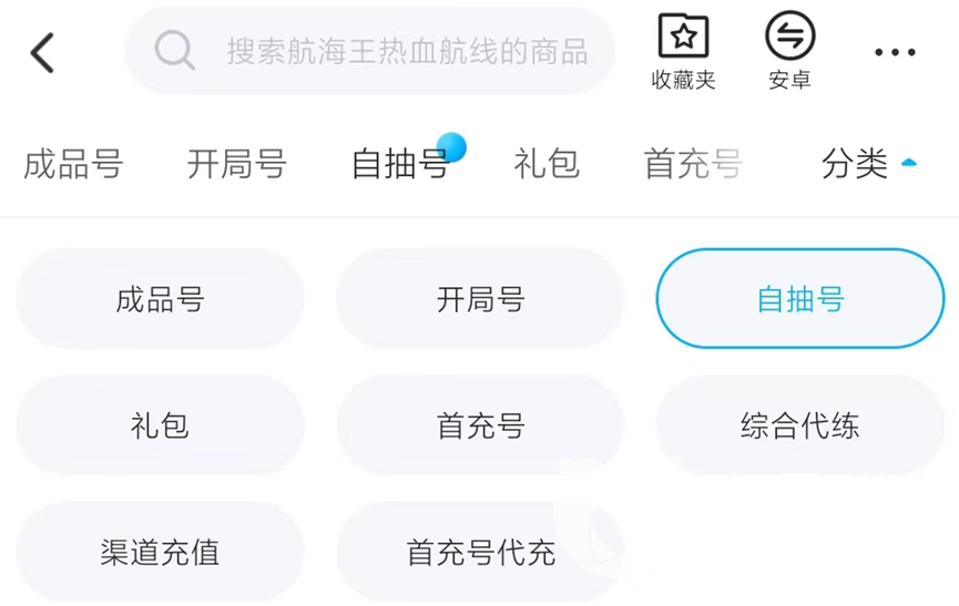 一些小平台都是只有成品账号的出售,交易猫就不只有成品账号的售卖,平台内有包含航海王各种成品号、开局号、自抽号、道具礼包、大神代练等多种类型的交易,而且平台内的自抽号购买后还能拥有比较好的开局体验,购买也比较合适。
