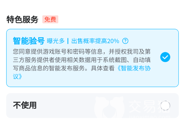 1.首先,用交易猫卖号,操作非常简单,只需要点击“我要卖”,接下来按照指引一步一步进行即可。选完账号系统以及区服之后,在页面的底部有一个“特色服务”,这一功能可圈可点,如果是真心的出售账号,并且信任交易猫的小伙伴,可以尝试一下这个功能,将账号密码等信息提供给平台,接下来平台会为大家进行智能登记,不需要太多复杂的步骤,就可以轻松将自己的账号上架出售了,简直是懒人福音。
