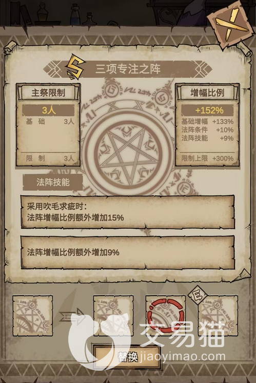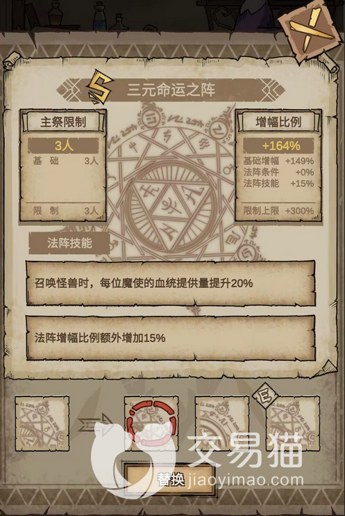 第二个要向大家推荐的是三元命运之阵,同样也是s级别的法阵。在法阵增幅上大概的效果是差不多,但在血统上就能够体现出明显的优势。如果比较在意怪兽的血量,就可以使用这个法阵,也是非常好用的。