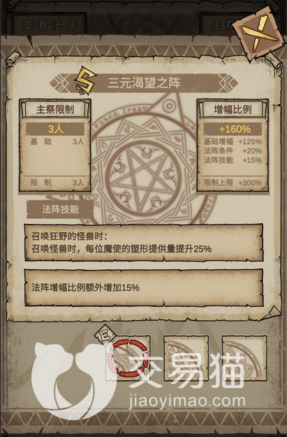 对于大多数玩家来说,三元渴望之阵是比较好的选择,在这里面的强度也很大。此法阵为s级别,有很高的增幅比例,基础增幅能够加134%。而且在召唤特定个性怪物的时候,能够将魔使的塑形能力快速提升。法阵增幅本身就比塑性要提升得多,使用了三元渴望法阵之后,魔物的属性会有一个很大的提升,在魔能、燃火和血统上面,都能够发挥出特别强的实力。