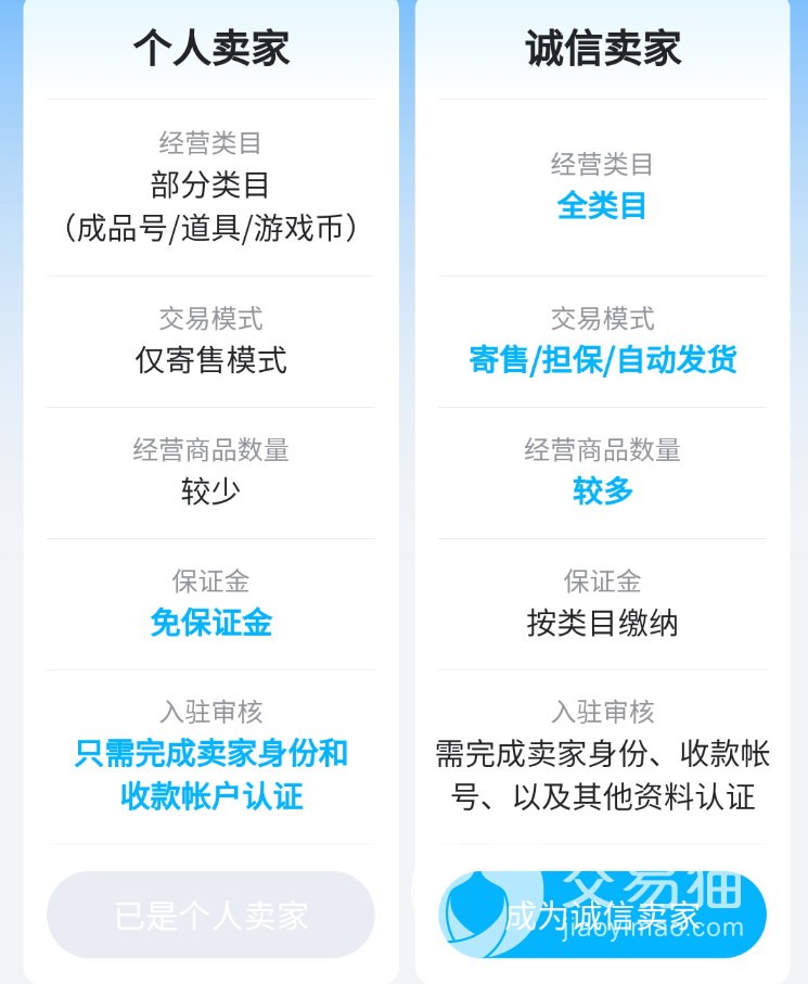 2.针对卖家方面,平台是有很大扶持力度的,在大家完成相关认证,并满足一定条件后,可从普通商家升级成为诚信卖家,这些商家可经营的商品数量更多、类目更丰富,此外,交易模式也有所改变,从原本的仅限于寄售模式,变成了寄售、担保及自动发货三合一的交易模式,非常不错。看完本篇介绍,大家有没有觉得交易猫的确是一款不错的交易软件呢?