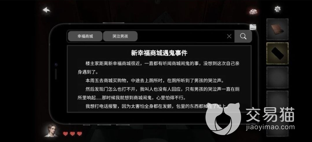 收集完以上的道具之后,我们就会来到第二章。进入到这个章节之后,玩家们就要比较关注自己的生命状态了。首先就需要在手机上搜索有关哭泣男孩和幸福商城的信息,把整体的故事剧情看完,再完成走出浴室的任务。我们要做的就是把红色小车放在地上,跟随着小车一直走,得到夜光戒指。后面还要去到洗手池,见到一个小男孩,与他进行捉迷藏的游戏。