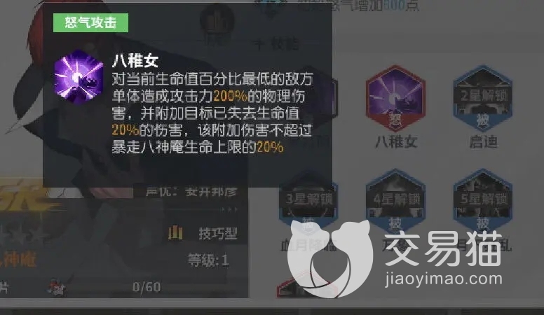 技能方面,暴走八神的被动就是进入血月状态,获得对周围敌人的百分比溅射伤害,所以对群能力不错,而达到五星成长后,会获得新的月下狂乱被动,在厂商有低血量敌人时会触发瞬间回怒和防御穿透效果提升,本场战斗接下来时间都会持续。