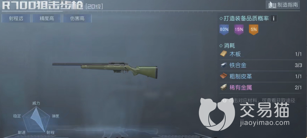 r700在游戏中其实是一把非常厉害的枪,这把枪在游戏中是一把单发栓动的狙击枪。在中远距离中伤害非常的高,因为这把武器是单发的,所以射速方面会比较慢,但是手感很高,而这把武器作为狙击枪,基本上命中目标后能够一枪将小怪带走。