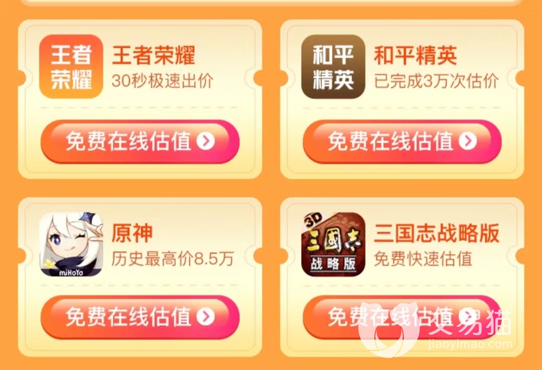 另外,交易猫平台还有专门的游戏账号一键估值专区,在这个专区中就支持王者荣耀的账号估值。只要将账号信息输入估价界面就可以做到一键估值,非常方便和快捷。由于这里的估值是按照账号内各种稀有人物、稀有皮肤来估算的,与前文说的方法不同,因此可以参战两个方法的结果来综合分析出目标账号的实际价值区间。