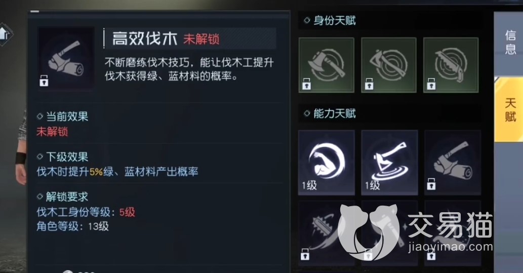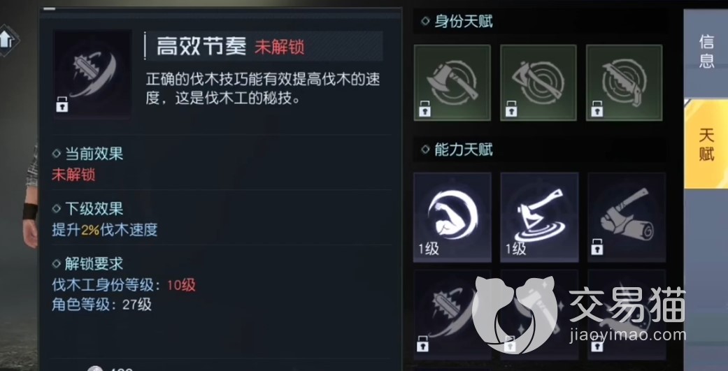 升级身份需要去进行对应操作,而解锁的对应的天赋可以提升操作效率(例如伐木效率),例如伐木工这里5级可以解锁高效伐木,提高产出,10级的时候提升2%的伐木速度,15级减少斧头耐久。