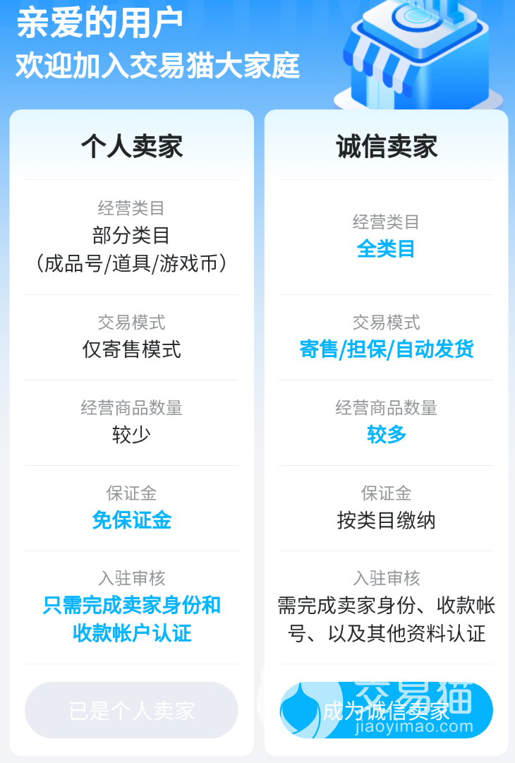 1.对于优质卖家,开放升级渠道,用户们可以通过完善资料、提供保证金等方式,成为平台的诚信卖家,针对诚信卖家,平台开放更多卖号渠道,首先是经营类目,会由原本有限的类目变成全类目,同时支持寄售、担保以及自动发货共三种交易模式,可经营的商品数量也会提高。总而言之,平台对于优质卖家的扶持力度很大,小伙伴们感兴趣的话可以了解了解。