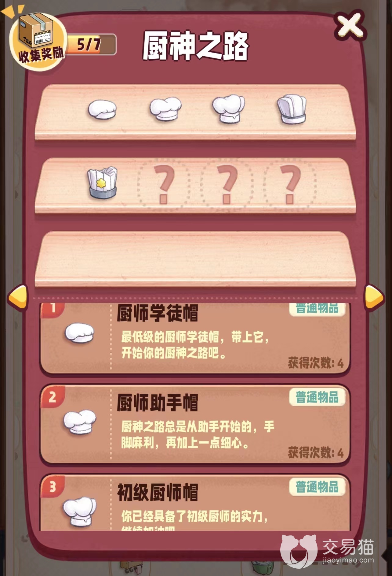 厨师学徒帽—(合成)—厨师助手帽—(合成)—初级厨师帽—(合成)—中级厨师帽—(合成)—高级厨师帽—(合成)—大厨帽—(合成)—五星级大厨帽—(合成)—厨神帽