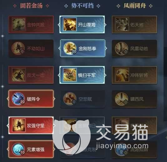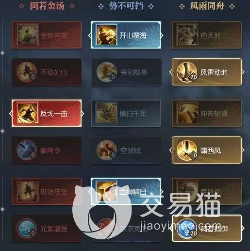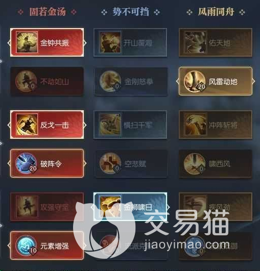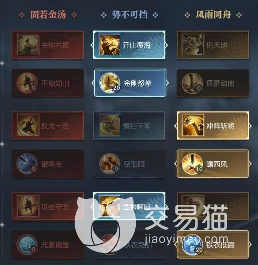 以下是大家选择的技能,这些大家基本都是相同的也就是在天赋加点上面的偏差,而下方是大铁衣的带法,如果是小铁衣的话因为伤害不够还会影响队友,所以可以选择发挥自己的特长,选择天赋第一行的金钟、第四行的空悲赋和第五行的攻强守坚,这样的点法是以增加自身防御为主的,负责在前排吸收伤害。