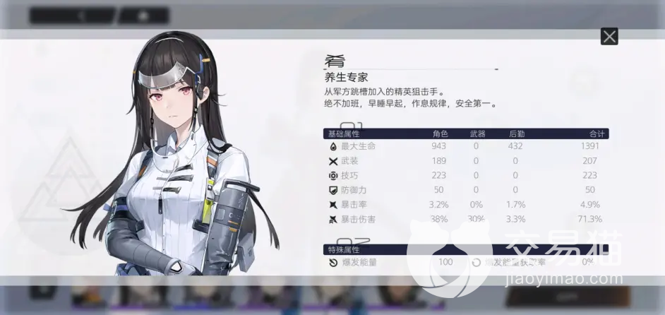 肴是一名从军团跳槽加入的狙击手,外表上看起来是个冷酷的大姐姐,拥有极高的狙击技术和合理的作息时间,绝对会准时下班,在战斗中主要担任远程输出的位置,需要队友的保护才能发挥完全价值。
