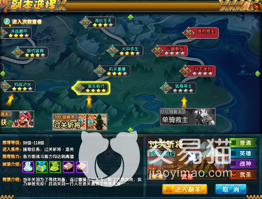 过关斩将要求玩家达到90-110级才能去这里玩,而且还规定了必须有两名玩家组队,而且只能玩一次。而要通过这个副本,核心思路其实非常简单,就是进入副本,打败BOSS。但是有的人才开始玩这个游戏,连入口都是找不到的。其实入口很见到,只要到东岭关前山找到江陵左慈的分身并跟他对话,然后接受他派发的任务,就可以进去了。这里一共是有四个关卡,记得找一个队友一起进入,才能顺利开启副本。
