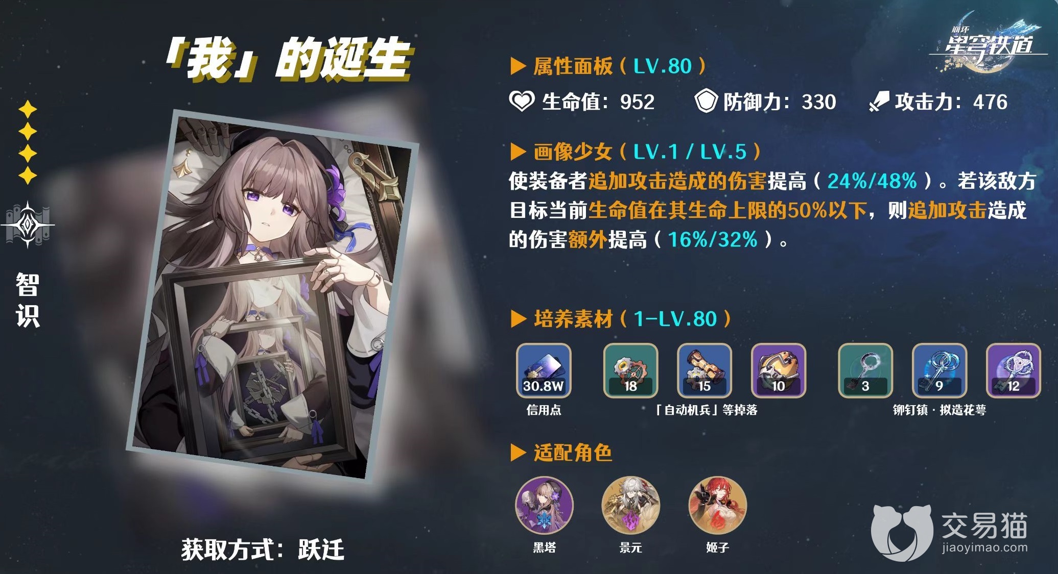 4、早餐的仪式感,提高造成伤害值并且当消灭敌方单位后,携带者攻击力获得提升,可以叠加。5、别让世界静下来,进入到战斗中之后可以立即恢复能量点,终结技造成伤害提高,能量值提高之后自然释放大招速度也会提前,非常适合青雀这样角色。6、我的诞生,装备之后造成伤害提高,如果选定攻击目标当前血量在半血以下,则提高追加攻击伤害。这是指向性非常强的一个道具,非常适合黑塔选择,当然其他有追击效果角色也能使用,但是效果不佳。