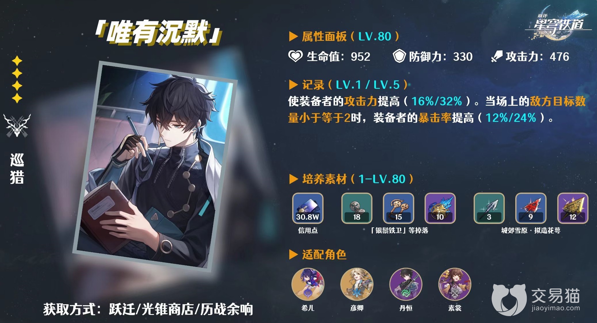 要想将这些光锥安排给合适角色使用,一定要先了解效果,在四星中最值得养成的有以下几个。1、唯有沉默,在boss攻坚战中拥有非常强的效果,虽然群体伤害比较乏力,但是适合很多训练类型角色,并且不需要太高几率只要肝一些就能获得。2、论剑,需要一直攻击同一个目标发挥出最佳效果,可以帮助擅长单体输出角色快速击败敌人,同样适合在单体boss作战中使用。3、重返幽冥,只需要激活大月卡就能获得,提高携带者暴击率,并且在触发暴击后有几率将对方身上增益状态解除,非常适合在模拟宇宙等战斗中使用。