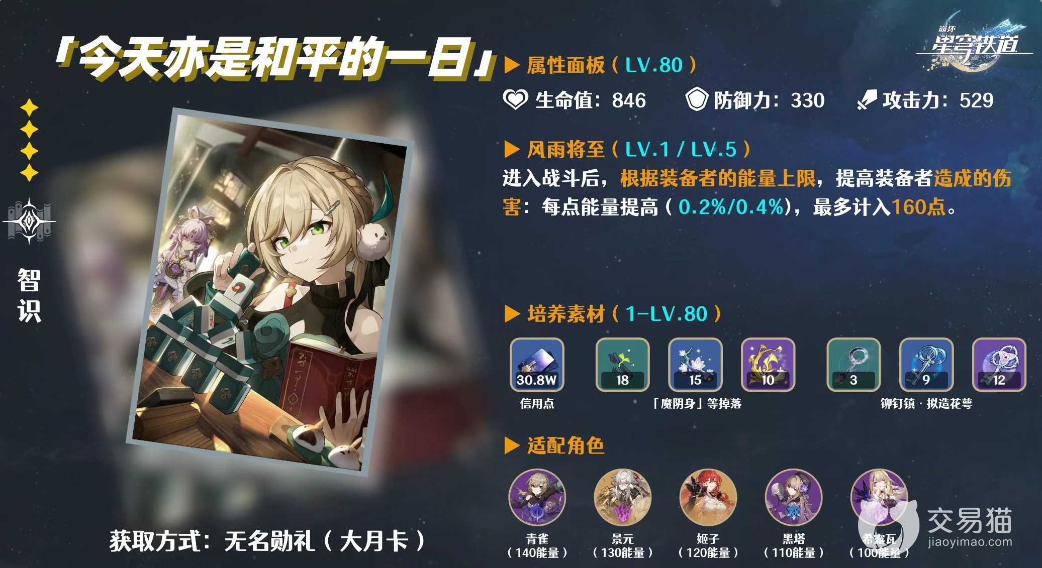 7、今天亦是和平的一天,切换到战斗场景后,计算装备者当前能量上限,按照上限来提高造成伤害,越多则效果越好。同样是大月卡获取的光锥之一,能量值比较高角色极其适合,例如黑塔、姬子、青雀等。8、散步时间,提升攻击力并且如果攻击目标正在被灼烧或裂伤所影响,则造成伤害进一步提升。搭配时候尽量选择带有裂伤效果或灼烧效果角色,例如克拉拉、虎克等。