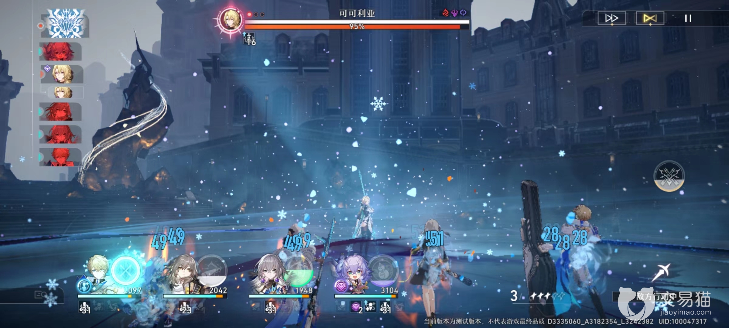 接下来需要了解 boss在战斗中主要技能和对我们造成难度的关键所在,第1个是可以召唤出冰柱,这是一次对全团都能造成大范围伤害的技能,因为伤害非常高,所以一定要尽快清除掉。第2点是在开启第二阶段后,boss会将布洛尼亚召唤过来,这名角色利用自身技能给可可利亚带来极大加成,可以将对方输出节奏大大加快,此时我们就要面对不小的压力。第3点是该boss在攻击时候有几率造成冰冻效果,如果控制住当前回合最关键角色,就很有可能导致团灭。