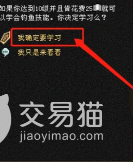 将饺子交付之后,系统会出现是否学习的提示,大家点击学习的按钮之后就可以瞬间学会钓鱼啦,后期只要大家到有水的地方,点击钓鱼的按钮就可以在上面钓鱼,钓上来的鱼是可以当做材料使用的,或者是后期也会有一部分的NPC喜欢鱼。