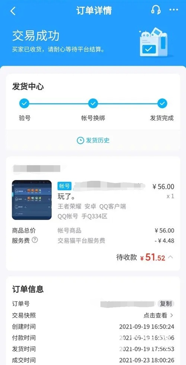 账号出售之后大家可以在商品的订单详情页面查看相关的账号订单信息和交易快照,同时也可以看到商品交易的服务费扣除多少,如果对服务费扣除有什么问题的话也可寻找客服解答相关的疑惑。