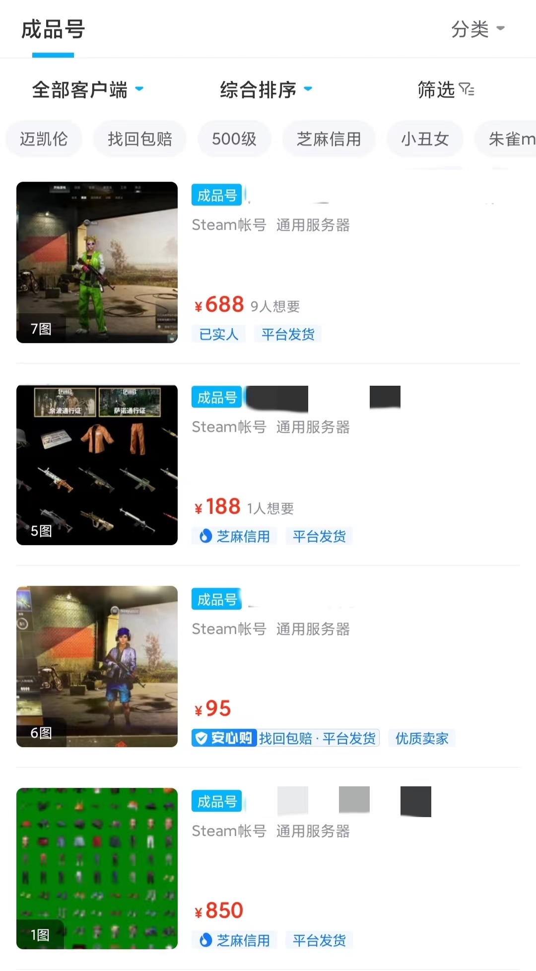 无论玩家想要估价的账号中是有小丑女和朱雀这种比较热门的皮肤还是一些冷门皮肤装备,在交易猫上都能找到与之相似的账号,因为交易猫是一个规模够大的账号交易平台,交易猫上有很多卖家出售绝地求生账号,什么配置,什么价格的都有,玩家不有担心找不到和自己账号差不多的,玩家找到和自己账号配置相似的账号后就可以根据那个卖家的定价,然后给自己的账号大概估个值。