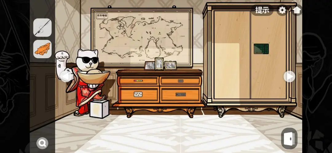 这里再点击窗户可以看到外面的场景,在树下面会有一些图案各位可以记下来。然后往右走到地图那里,此处的左上方的抽屉开启的方式就是与外面的图案有关,开启之后能够从中获取到一个螺丝刀。而这个抽屉右边的那个开启是根据前面获取到的那串字母来的,打开之后可以获取到一个遥控器,里面还会有一些卡片,各位需要记住里面的场景对应的地址,并安装时间顺序来。