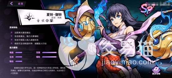 原作中作为女主的存在,在游戏中也非常厉害,属于少有的治疗职业,因为其辅助定位,属于队伍的万金油成员,作为一名技能多为治疗的角色,不仅可以提供单体回血效果,技能还提供减速效果,适用性非常好。虽然是奶妈,但是普攻可以对敌人造成减速状态,并且持续普攻可以叠加,对付灵活的怪物十分有用。对战方面可以使用一技能形成黑洞,造成聚怪效果。夏玲基本可以看做没有伤害技能,所以当好辅助就可以了,为队友提供良好的输出环境。