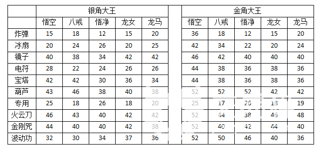 首先,根据对于每种角色宝物及波动功对两大经典boss造成的伤害来看,面对银角大王的时候,悟空带上火云刀的伤害是最高的,有46,而当boss换成金角大王的时候,可以选择的就非常多了。悟空带上葫芦、火云刀、金刚咒、波动功,八戒配上葫芦以及沙和尚带上葫芦都能够达到52的最大伤害值。