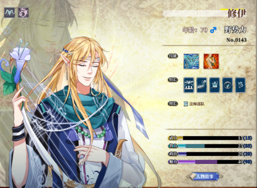 第六位介绍的是俢伊,俢伊是一名精灵族的美男子,他在游戏中的定位就是一个增加攻击力和攻速的辅助,和前面介绍的血剑搭配是非常不错的,而且被动技能可以让他对其他敌对英雄的劝降几率增加20%。