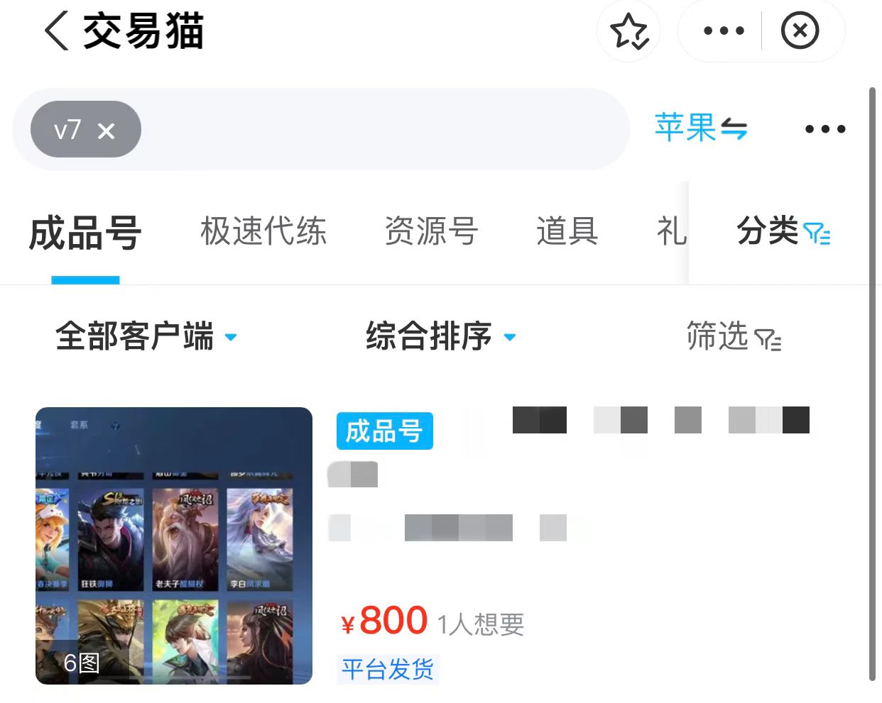 交易猫中挂出的王者号是非常多的,在售账号的段位、稀有皮肤、英雄等都交代得很清楚,玩家们可以去搜搜v7的号,看看和自己的皮肤数量以及品质差不多的账号,根据对方定出的价格,来判断自己的账号大概值多少钱。价格一般都是跟着市场走,而交易猫的账号成交量非常大,因此很有参考的价值。