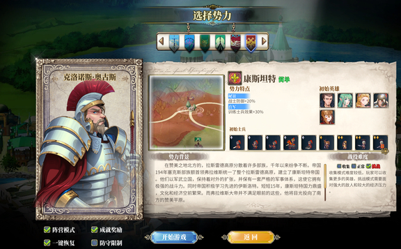 游戏中排在第一位的势力就是康斯坦特,这个势力是一个非常强大的国家,而它强大的基础就在于它的高端人才非常的多,那对于我们的军队的科技发展来说,是非常有利的,所以它非常的适合新手,要知道康斯坦特也是大陆上面最强的一个国家了,而且它的西方和南方都是一个空缺的存在,没有强力的国家存在,同时它的其他方向又靠着天险,也就是说它不但易守难攻,并且非常的容易扩张。
