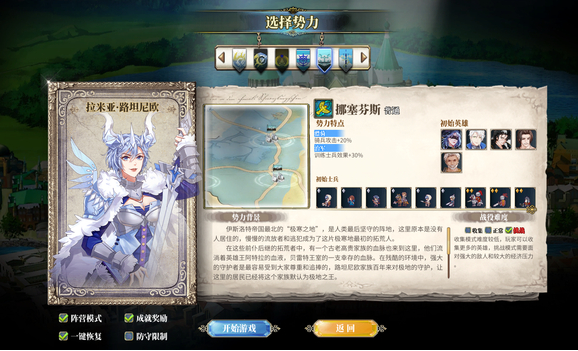 排名第五也就是最后一位的是挪塞芬斯,这个势力拥有着最强的骑兵兵种拉米亚,而拉米亚也拥有着很强大的策略能力,是个很不错的将领,很多其他势力为了资源多少都会和挪塞芬斯打过好几次,如果有喜欢战斗的朋友选择这个势力是非常不错的决定,它虽然处在极寒之地,但是资源并不匮乏,相反周边的国家也都不强力,那我们扩张起来就会非常的容易。