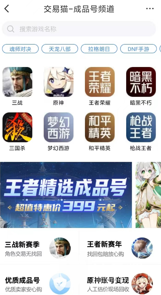 多个不同类型的账号交易专区,是交易猫帮助玩家们满足不同购号需求的主要途径,而天龙八部手游荣耀版账号在哪买的问题已经得到了解答。各位如果同时在玩多款游戏,也可以在平台内容随时关注游戏的交易行情。