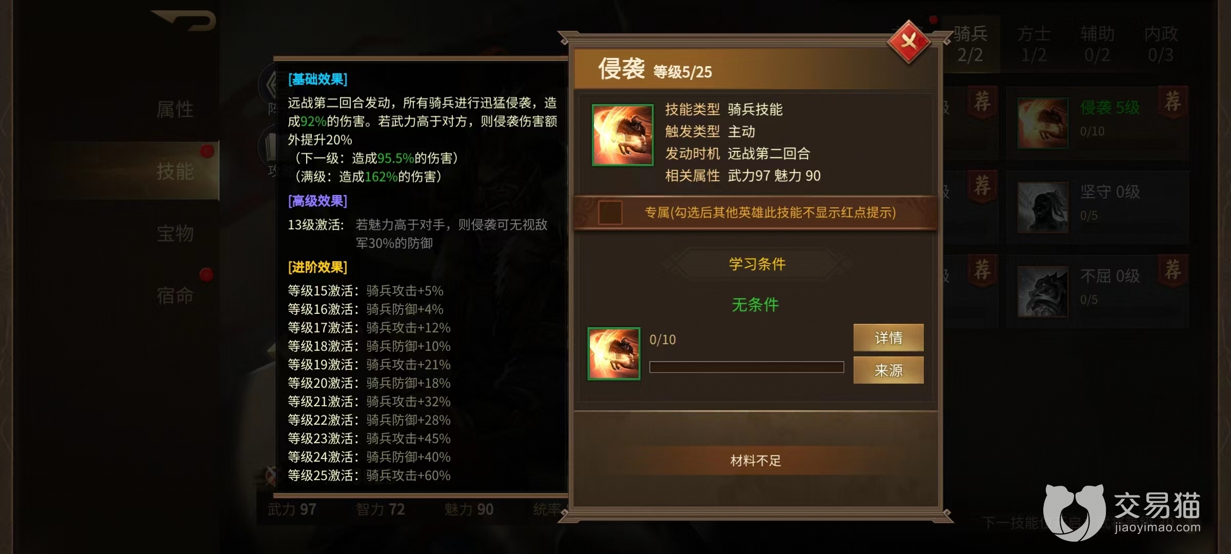 此外还能使麾下骑兵对敌方步兵造成伤害,加成每升级一级侵袭技能,就能附加很少概率使敌方进入到混乱状态,被混乱控制住之后随意选择攻击目标,是很好用的控制技能。这就确定了张辽最主要的核心技能就是侵袭,这是一个主动触发类型,并且在远战第二回合发动。使麾下所有骑兵快速对敌方进行攻击,如果自身武力高于对方,则伤害额外提升。张辽本身武力值超高,能够力压很多武将,所以在武力值方面绝对值得信赖。