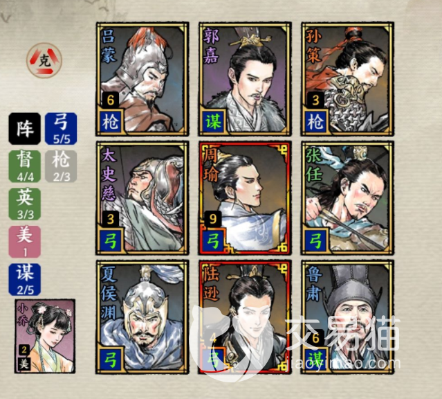 游戏里四都督队就是包含了这四大角色的队伍,游戏里最多小队可带九个人,所以剩下的位置是比较灵活的。这四个人分别定位是两个弓箭手加谋士以及枪兵的阵容,属于前排输出和辅助都有。