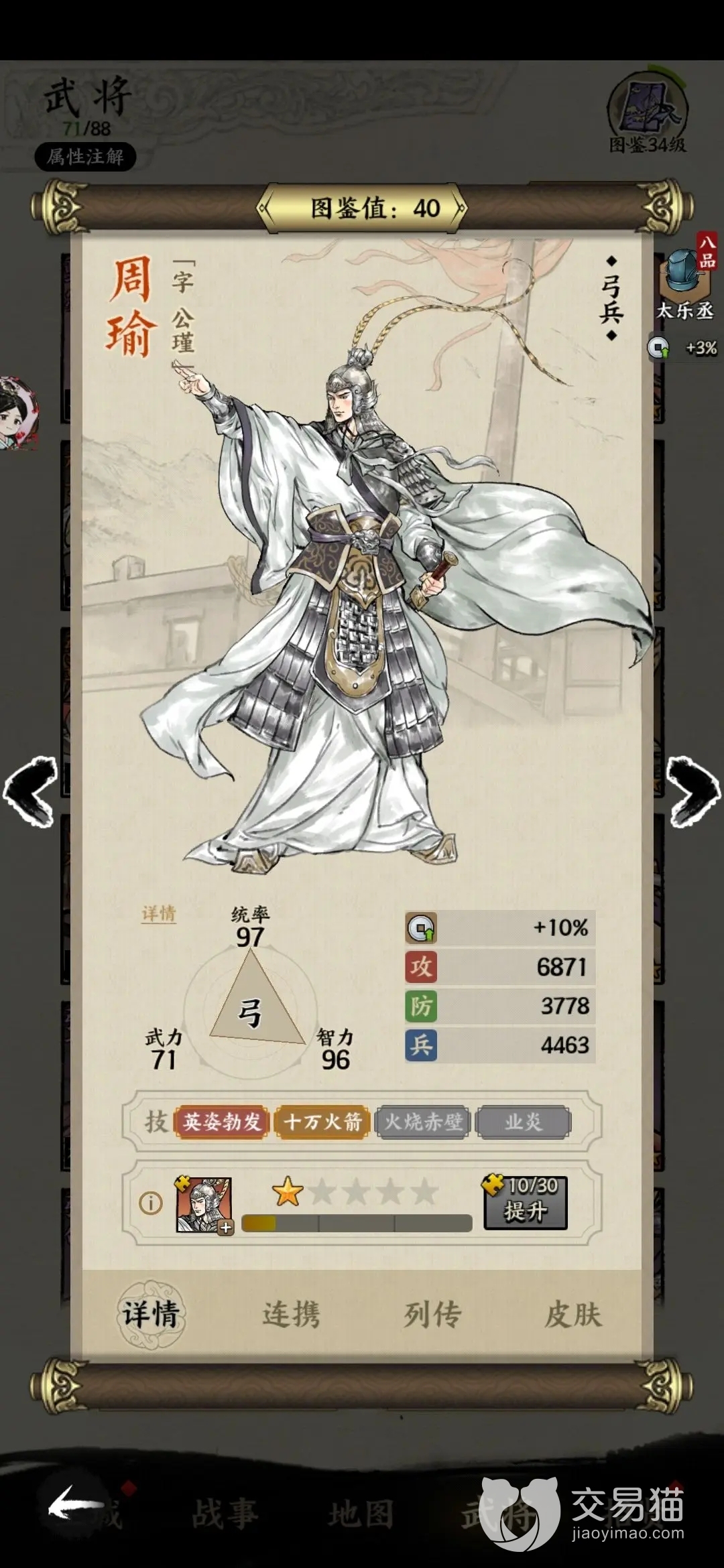 输出爆炸是四都督的特色。其中周瑜和陆逊两个弓箭手都拥有持续稳定且不俗的输出水平,然后这两个人之间也能产生很强力的羁绊火焰典故加成,进一步提高输出,二者也都是智力和统率的强将。