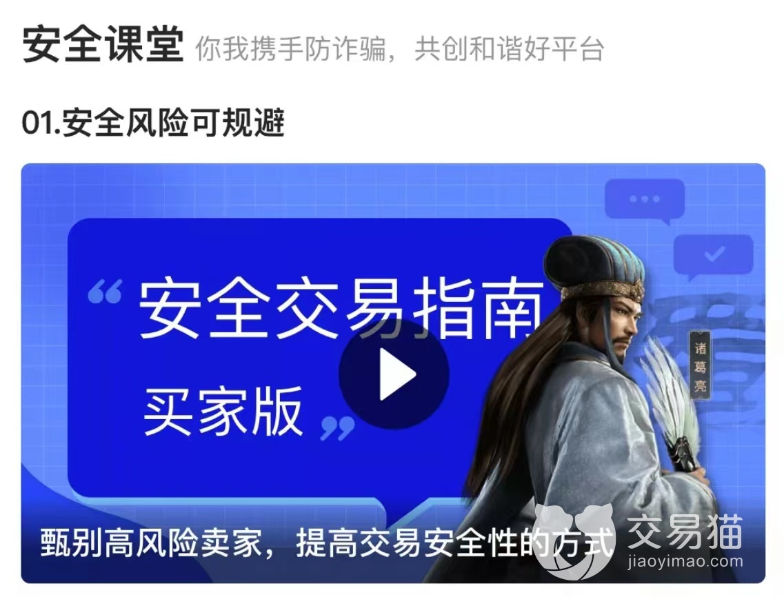 一、不用担心上当受骗:交易猫是阿里巴巴旗下的平台,依托支付宝,安全有保障。玩家们进入交易猫,在平台内进行交易,可以避免进入不靠谱的平台以及被卷入各类骗局的风险。除开提供基本的交易安全保障以外,交易猫还开设了安全课堂,帮助玩家们普及账号交易安全相关的知识,玩家们闲来无事时也可以多做一些了解。