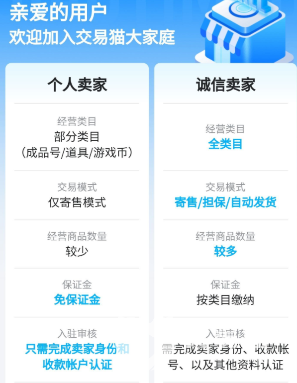 对于我们的卖家来说,有的时候肯定不是仅仅出售一种商品,大家多渠道的运营才是最有利的。因此在交易猫中不仅可以进行成品号的交易,还有更多的首充号、开局好等等的账号。这些特殊账号我们玩家只需要成为诚信卖家即可进行出售,有需求的玩家还可以自己开设一个店铺。另外对于个别游戏卖家还可以出售一些游戏道具以及货币,这样广泛的经营相信大家可以财源滚滚。