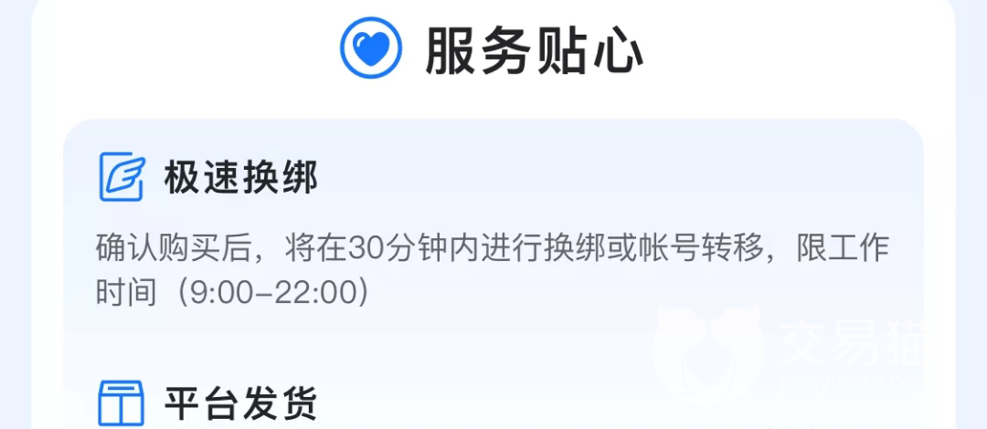 选择交易猫这个品牌去出售游戏账号的话,想解绑、换绑和发货等等这些方面的事情都是不需要大家去操作的,大家只需要对游戏账号的信息进行填写,然后再完成认证以后将游戏账号上架了,过后其余的事情都不需要大家去操心和操作。