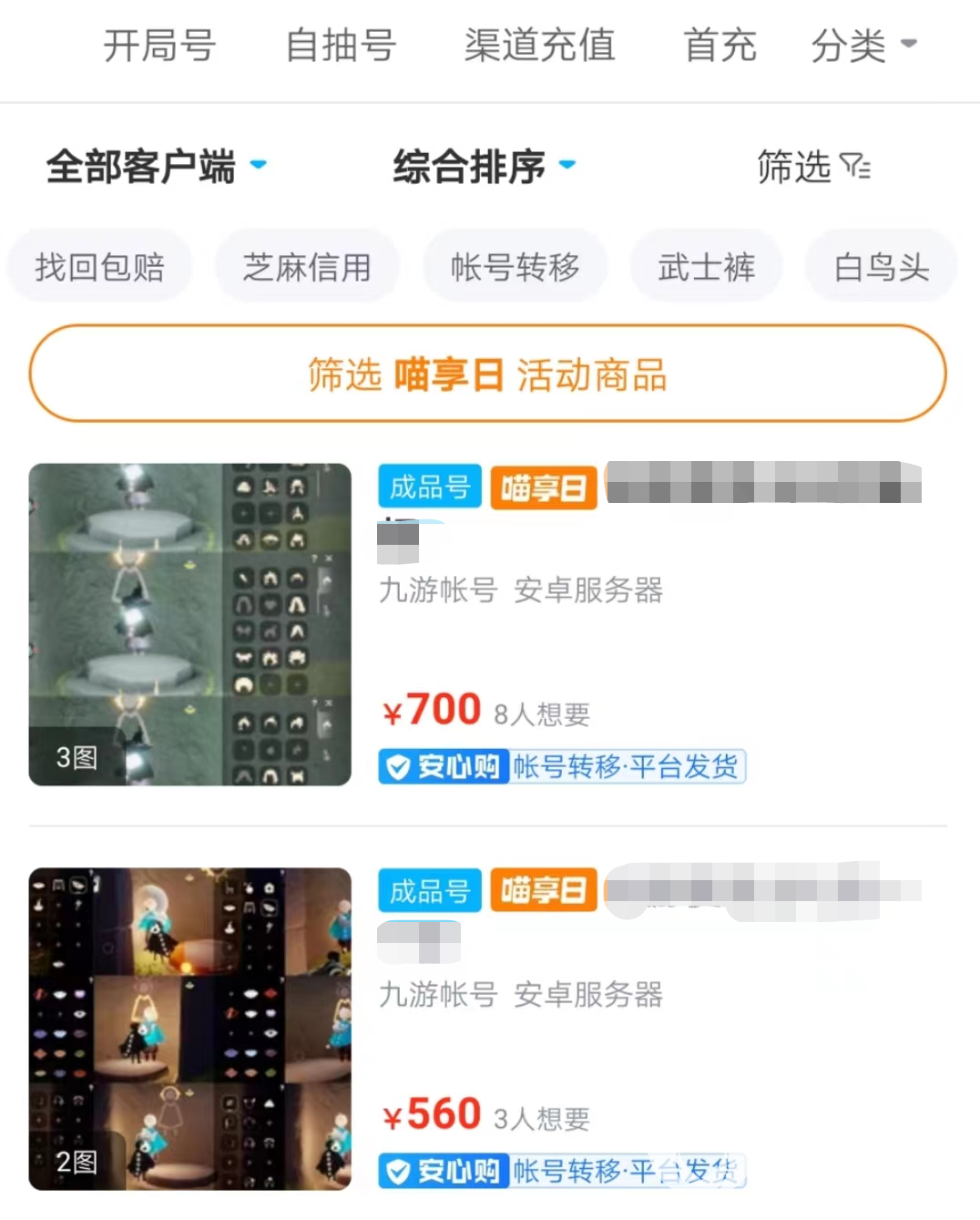 平台的游戏账号是非常多的,不仅体现在游戏种类多,还体现在账号类型多。像大家熟悉的光遇游戏,平台收录的账号就包括了成品号、自抽号、首充号等,其他游戏同样也有这些类型的账号在出售。大家只要进入到专区里面就可以开始挑选账号了,觉得账号太多选不过来的话,也可以看一看系统推荐,推荐的账号都是比较优质性价比很高的。