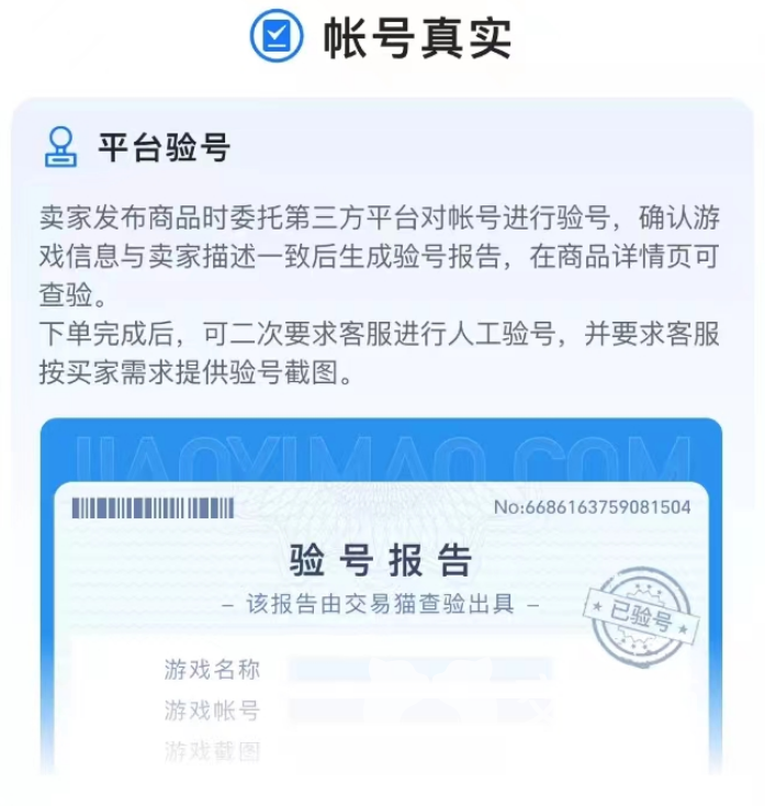 说完了关于账号如何挑选的问题,小编再来讲一下交易猫平台是如何为玩家们提供安全交易环境的。针对平台内的很多商品,大家只要能够看到平台验号的服务标志,就代表此账号已经完成了平台的审核,大家可以放心购买的同时,还可以要求客服在付款前再一次进行验证。