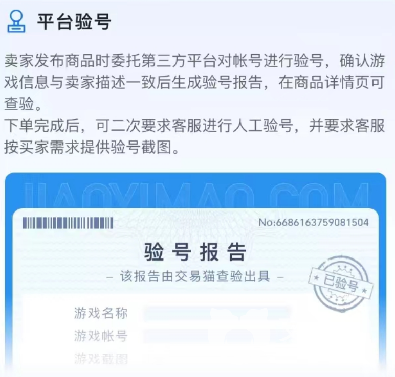 目前交易猫为了让玩家更安心的去选择商品进行购买,针对部分可交易的商品直接提供了平台验号的服务。此服务主要在于让更专业的客服介入到了验证的流程当中,相比玩家自己去验号,平台的客服会更有效率的去完成,同时也可以有效将虚假商品直接拒之门外,从源头解决交易安全的问题。