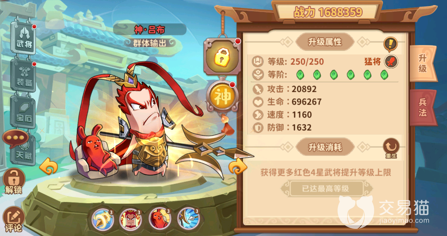 这个角色是所有的三国中都会出现的角色,因为在原版三国中就是非常强的一个武将,三个被动中都是可以将攻击提升的,大招是一个怒气技能,方天毒龙钻,这个技能可以在造成对面全体攻击的时候还有百分百的机会增加暴击。