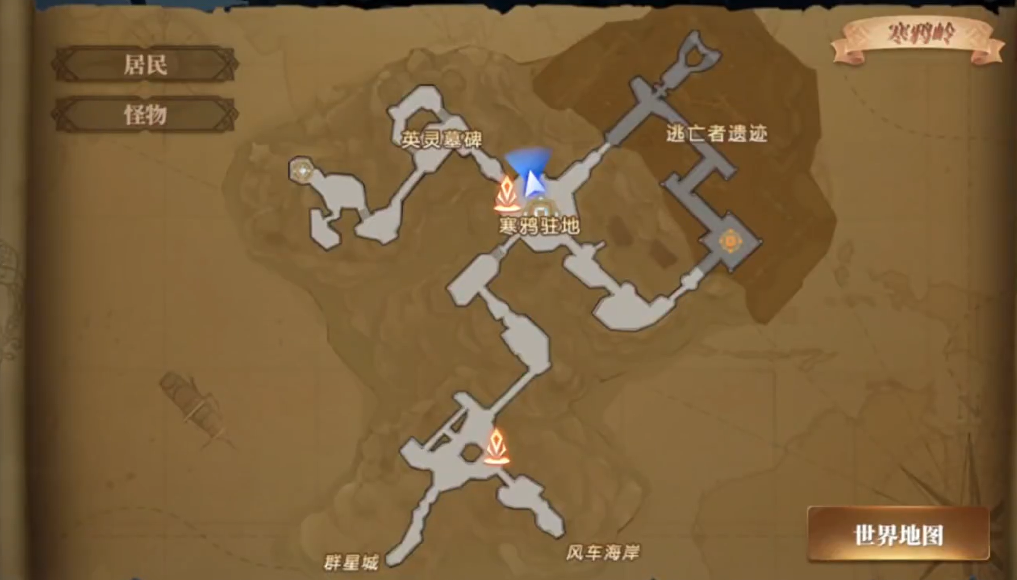 传送到寒妖岭地图的位置能看到一群NPC,第一个秘闻就是在这里刷新的。然后打开地图,在英灵墓碑这边有一个守墓人NPC,是第二个秘闻刷新点。