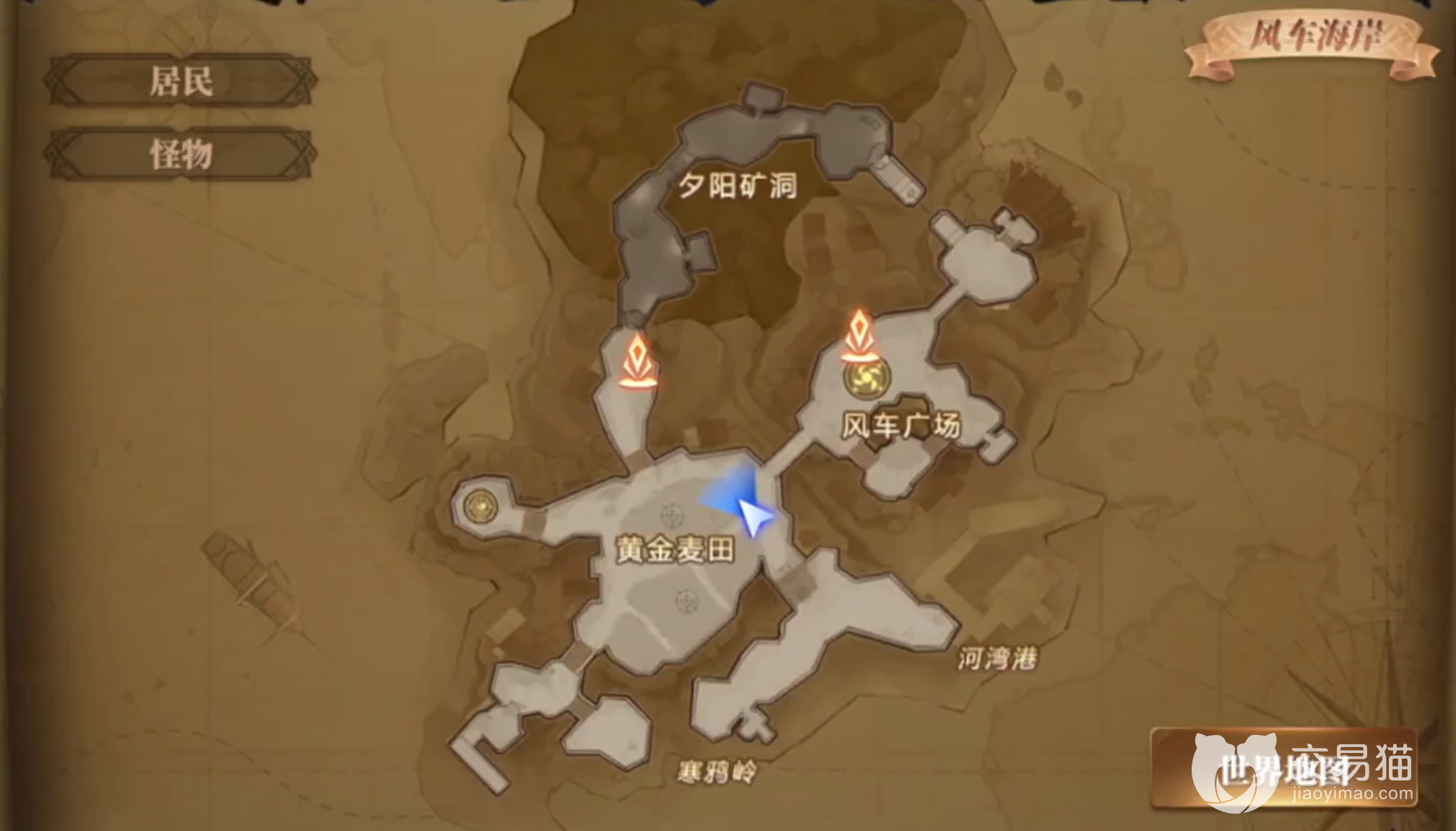 风车海岸的麦田旁边有一群小孩,这里有一个大梦想秘闻。往矿洞方向走,在矿洞外的麦田旁边有一个草棚,是一个小猫的秘闻。回到风车广场后往村长房子走,在村长孙女伊丽雅旁边有一个戒指,但是这个秘闻刷新概率非常随机。