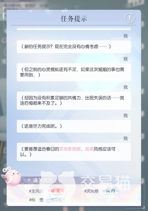 进入关卡内会发现里面有任务提示,我们根据提示主要选择“甜美”“简约”和“家居服”这几个标签就可以了,一次不要穿戴太多,分数够就可以了,以免后面两次服饰不够。